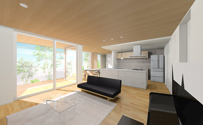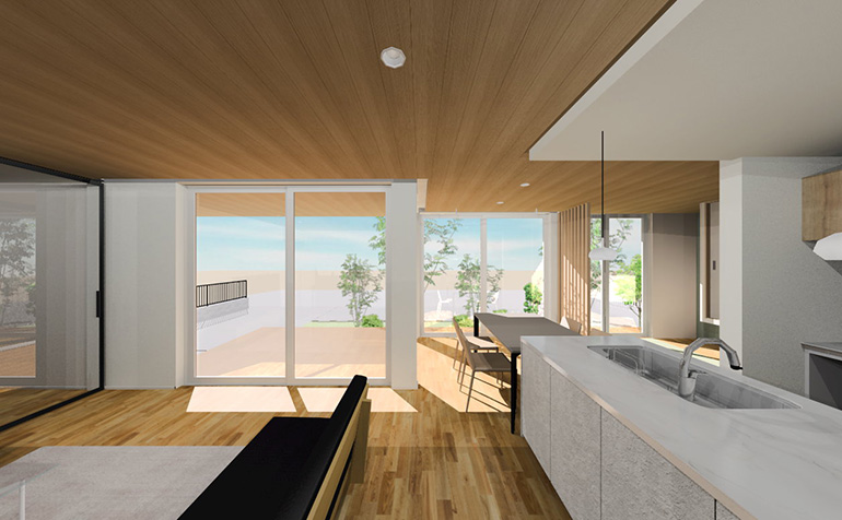 L字型に配置された22.5帖のLDKは、南面に大きく開いた大開口と、室内からテラスへと連続する軒天により、内と外の境界を感じさせない開放的な空間となっています。