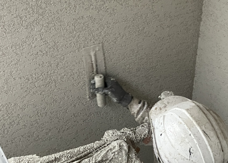 外壁の仕上げ作業は、角の仕上がりや、全体のバランスなどをみながら、職人さんがひとつひとつ模様をつけてきます。
