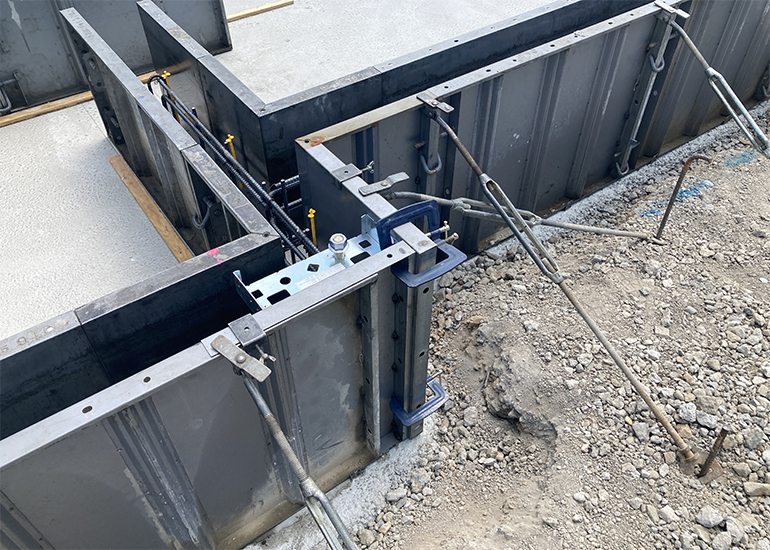 次に、配筋された鉄筋に型枠が組み立てられて、