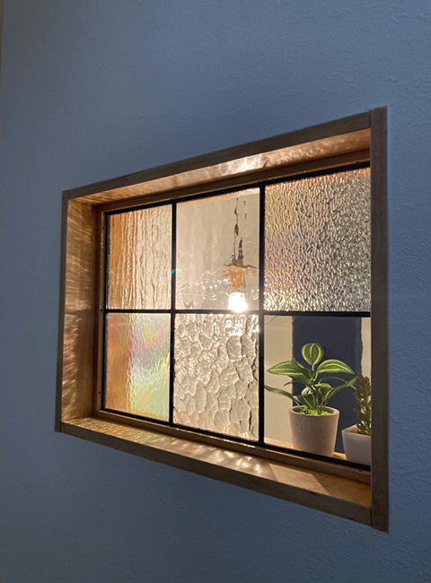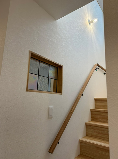 階段にはステンドガラスの内窓を設けており、隣の部屋から差し込む光がやさしく空間をつなぎ、やわらかな雰囲気を演出してくれます。